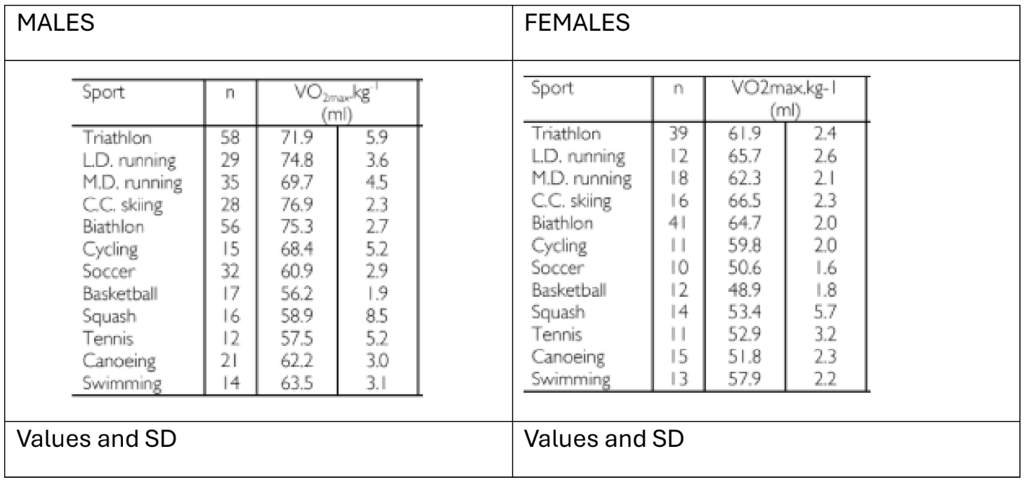 A third study comes from Vaclav Bunc on Czech adolescents as part of a book on Youth Sports by the Coimbra University (Portugal). The study compared the top 249 males and 146 females from nine sports in their physical and physiological attributes. Average age 17 years, ranging from 15 to 19 years, which conveniently is the Junior triathlon age. Athletes who had the opportunity to do VO2 testing will find this a valuable information for comparison and confidence,